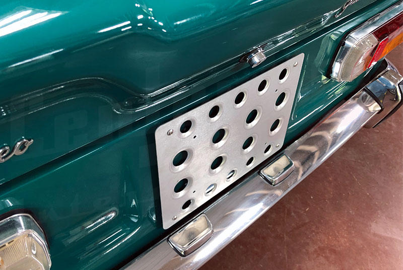 This bespoke aluminum rear plate mount allows you to easily mount a standard US license plate to any 101, 105, or 115 series Alfa that originally had the large, square Euro rear plate mount. The mount will also work for US cars wanting to mount the larger Euro rear license plates for show and display purposes. Will also fit a number of other Italian vehicles from the same period.