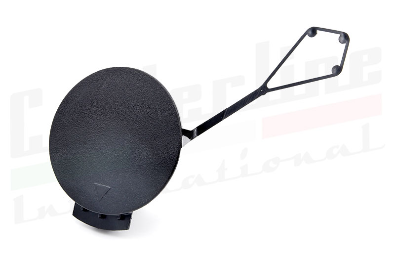 Plastic cover for towing hook opening on front bumper in textured plastic.