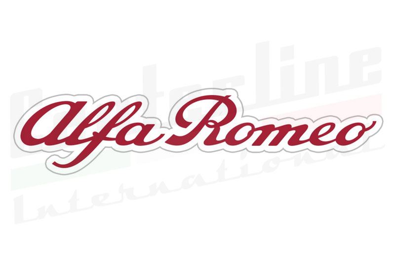 Small (approximately 3.5" long) Alfa Romeo script decal. Red on a white background.