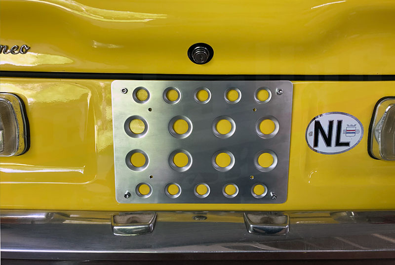 This bespoke aluminum rear plate mount allows you to easily mount a standard US license plate to any 101, 105, or 115 series Alfa that originally had the large, square Euro rear plate mount. The mount will also work for US cars wanting to mount the larger Euro rear license plates for show and display purposes. Will also fit a number of other Italian vehicles from the same period.